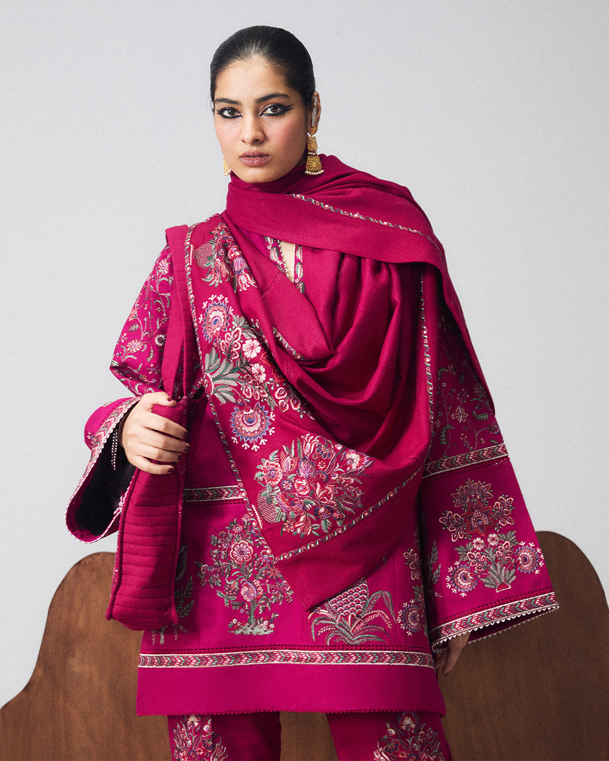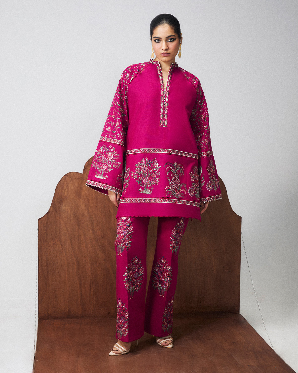 Description: A vibrant fuchsia pink knee-length shirt with soft raglan sleeves, beautifully adorned with intricate traditional embroidery inspired by colourful fauna and fruit motifs. The ensemble is thoughtfully paired with fuchsia pink bootcut pants, richly detailed with multicoloured embroidery, and finished with a coordinating scarf that adds depth and a harmonious burst of colour to the overall look.