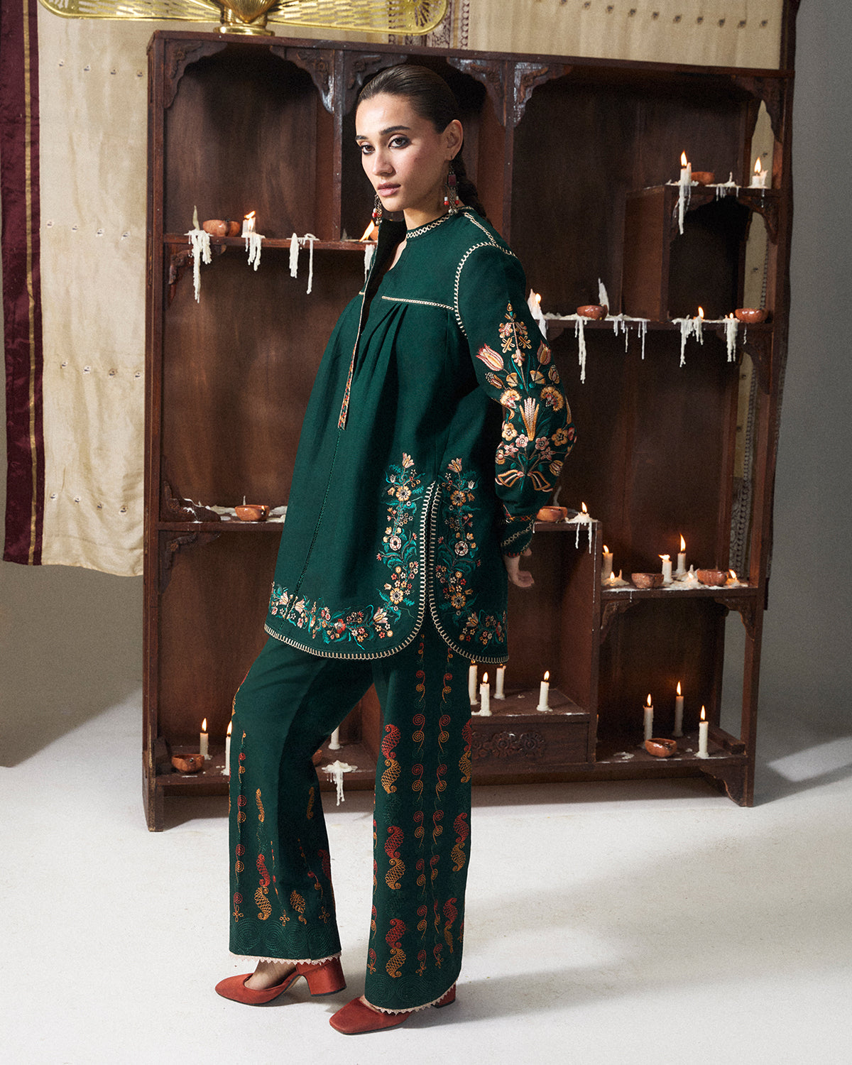 Description: A deep green short shirt, beautifully adorned with vibrant, multicoloured embroidery across the front and sleeves, adding an intricate texture. It is paired with matching deep green bootcut pants, richly detailed with colourful embroidery, and completed with a coordinating scarf that echoes the same intricate motifs. The ensemble combines bold, lively colours with refined craftsmanship, creating a harmonious and timeless look.