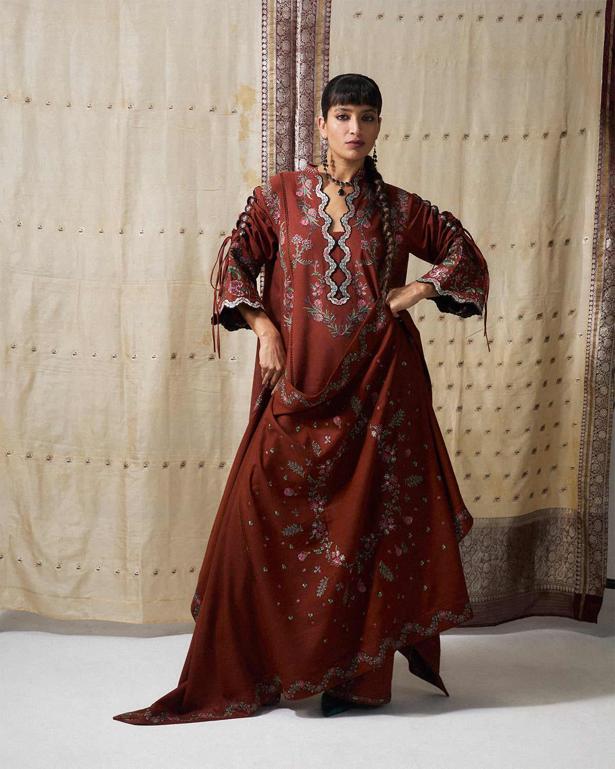 Description: A long paneled rust shirt, adorned with intricate traditional embroidery and featuring sleeves with delicate cutwork and tie details. Paired with rust-dyed trousers and a coordinating embroidered scarf, the ensemble blends artisanal craftsmanship with a timeless charm.