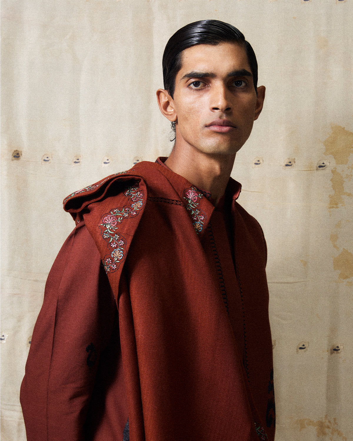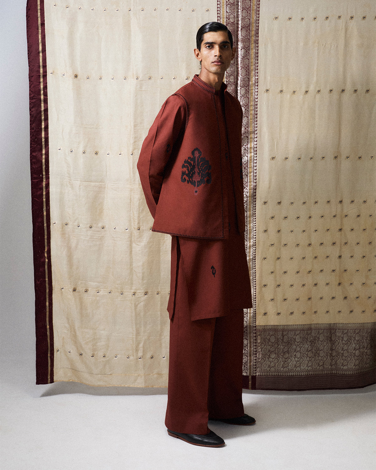 Description: A rust-colored kameez and pajama, featuring subtle monotone spray patterns that lend texture and depth to the fabric. Paired with a matching rust waistcoat adorned with black monochrome embroidery. The combination of rich rust hues, delicate embroidery, and classic tailoring makes the outfit a refined and timeless statement piece.