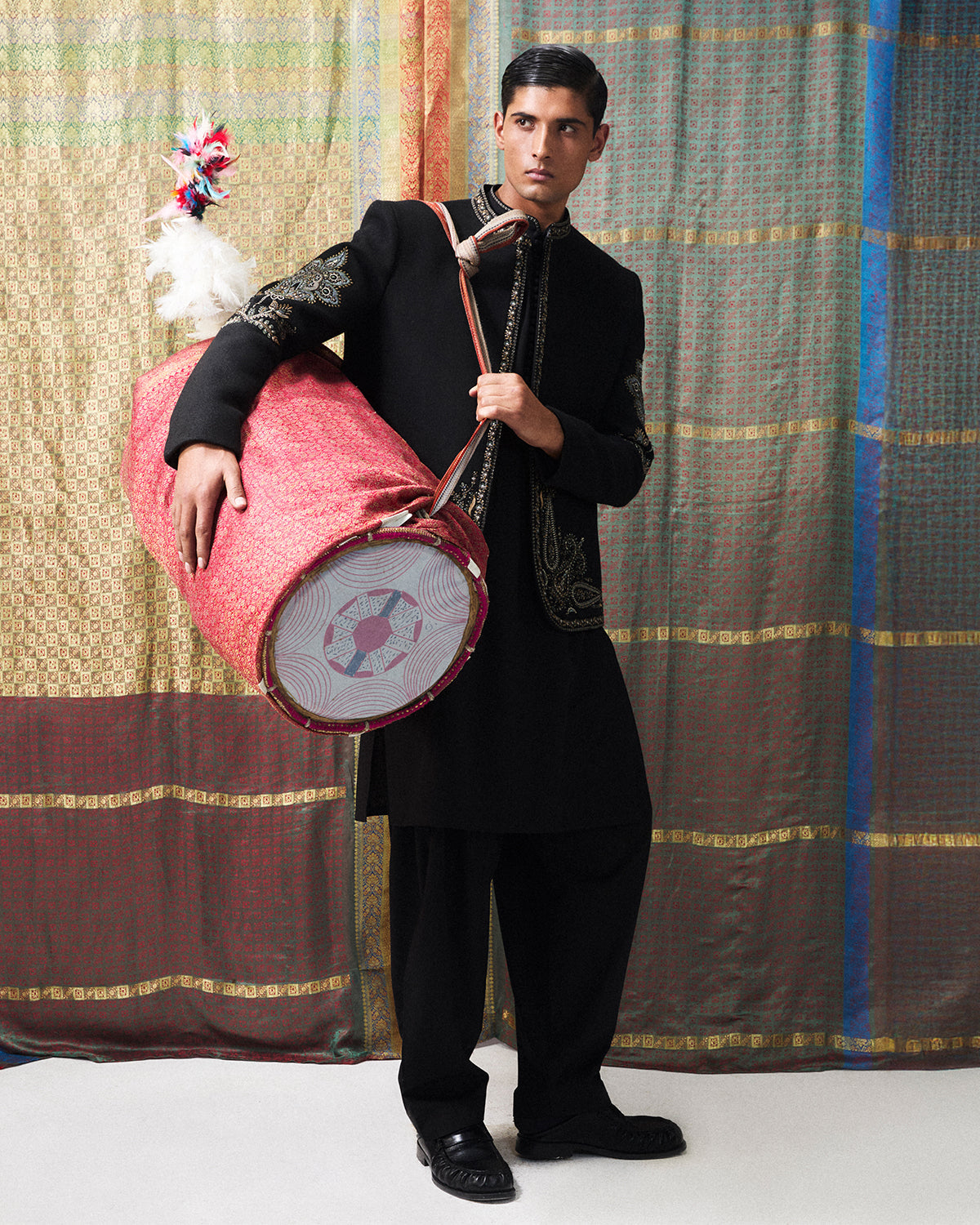 Description: A black dyed shalwar kameez, crafted in a timeless silhouette and paired with a matching black wool coat. The coat is adorned with subtle monotone traditional embroidery, adding texture and understated elegance to the ensemble. The deep, rich black hues combined with refined detailing create a sophisticated, classic look that blends heritage craftsmanship with timeless contemporary style.