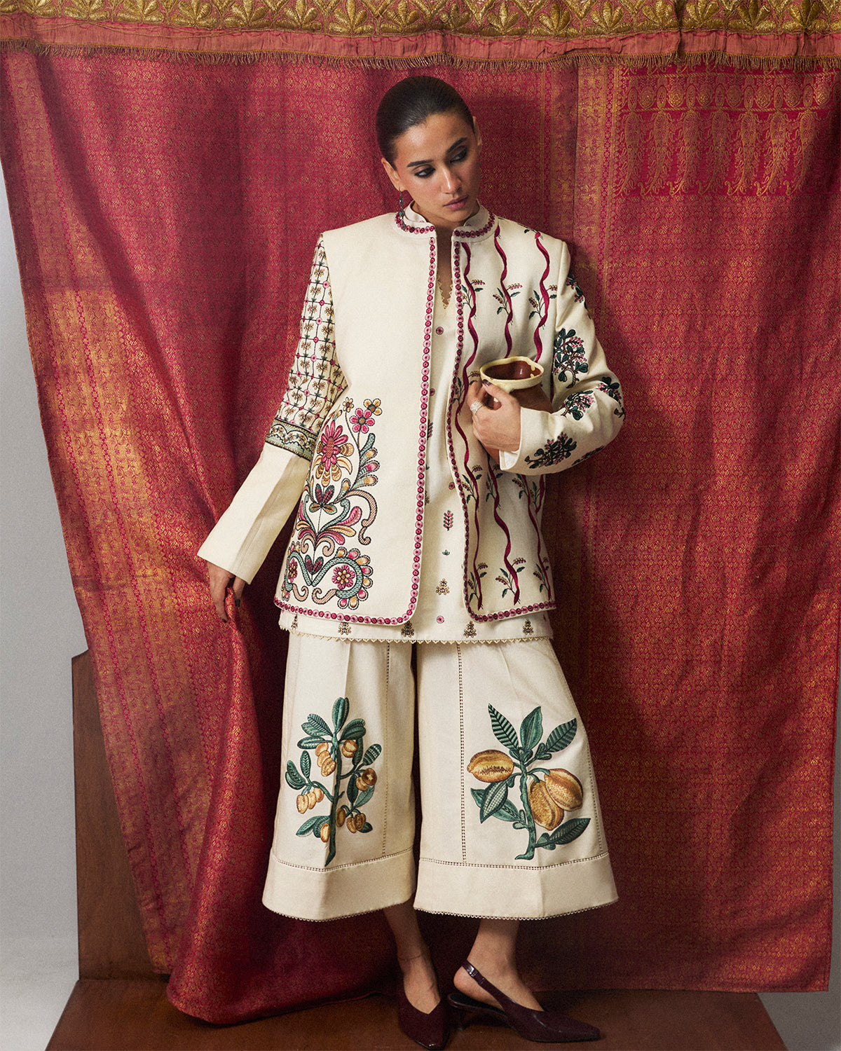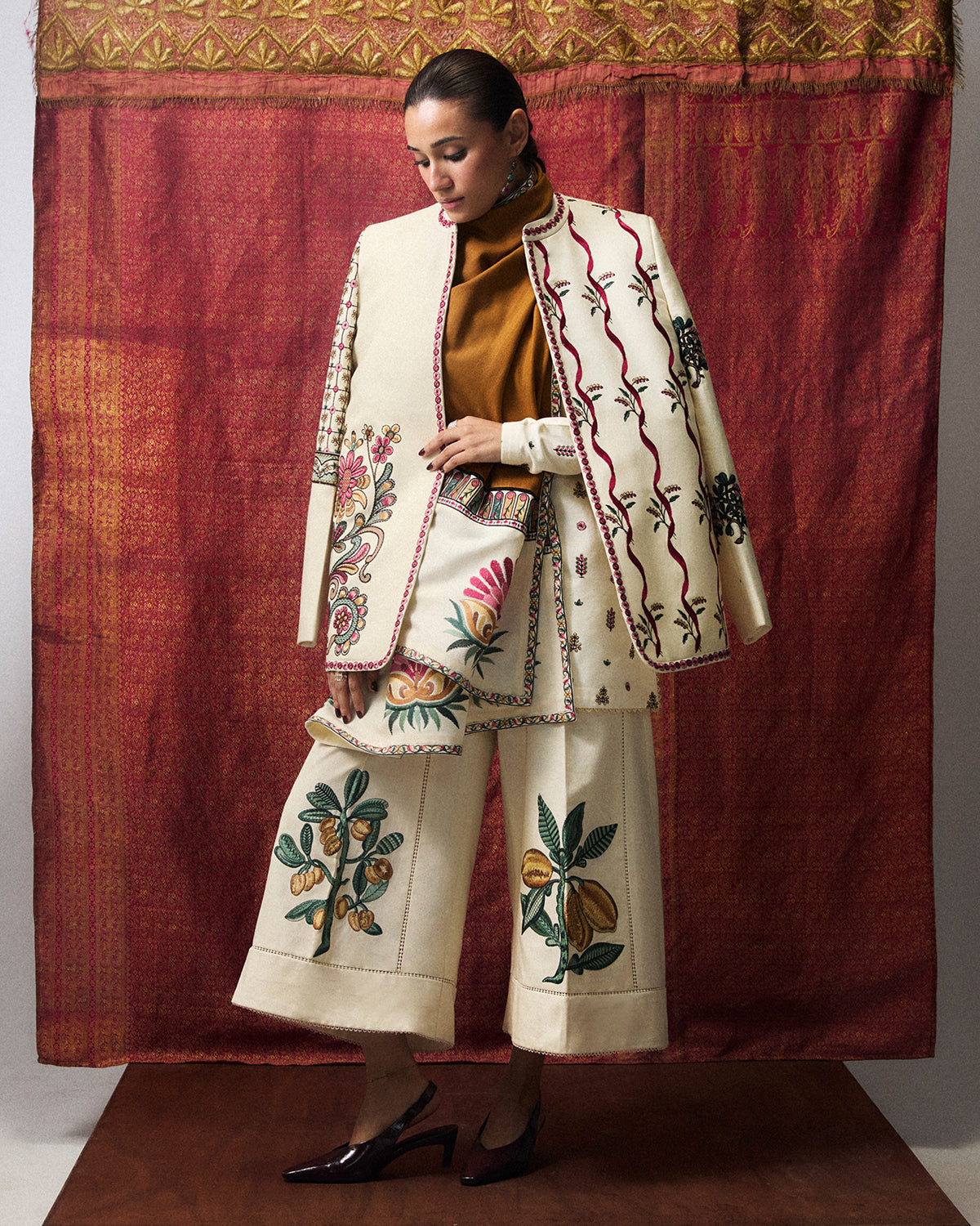 Description: An ivory short shirt with a ban collar, delicately adorned with multicoloured spray embroidery on the front and sleeves. Styled with ivory culottes featuring understated contemporary embroidery and a mustard-dyed scarf with an embroidered white patchwork border, the ensemble exudes timeless elegance and refined craftsmanship.