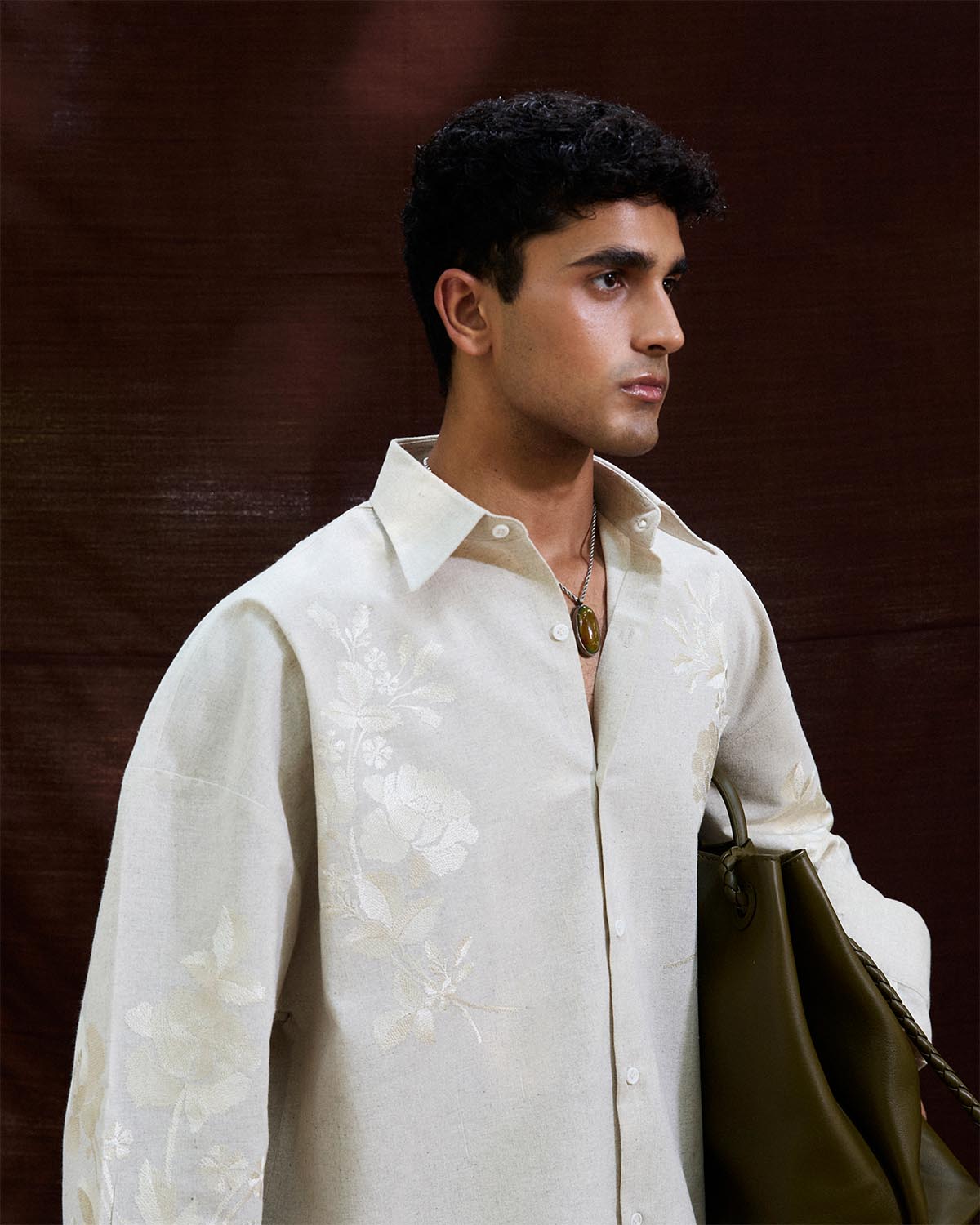 Description: Floral embroidery reimagined in monochrome restraint. A perfectly tailored shirt with pants — minimal, refined, and forever modern.
