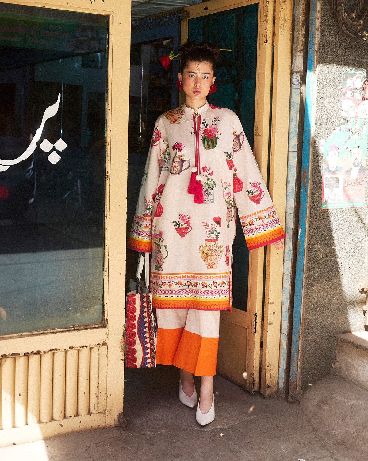 Product Description:The ivory Loose fit shirt boasts a charming flower pot print, accentuated by a refined band collar and delicate tassel detail for a touch of sophistication. Paired harmoniously with ivory culottes featuring striking tangerine color blocking, each piece combines comfort with modern style. Elevate your ensemble with the printed silk dupatta, showcasing vibrant hues and floral patterns that effortlessly complement the outfit. Ideal for both casual gatherings and special occasions, Jugnu invites you to embrace effortless grace and timeless beauty in this versatile ensemble.