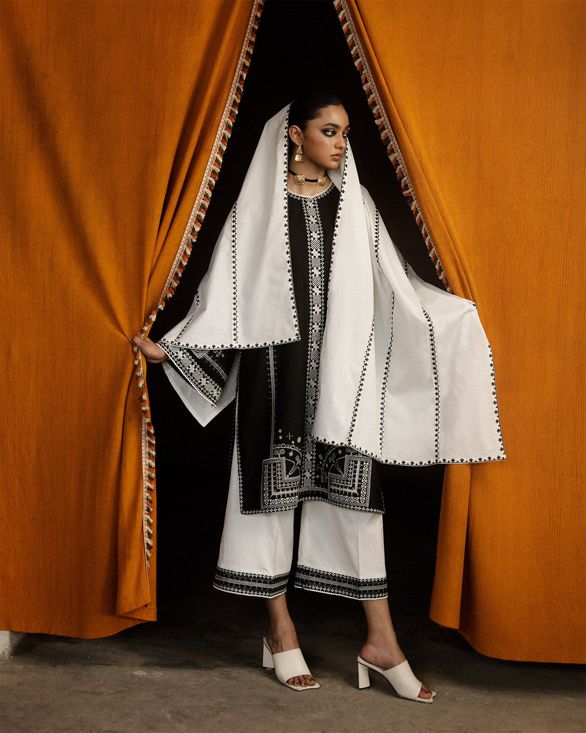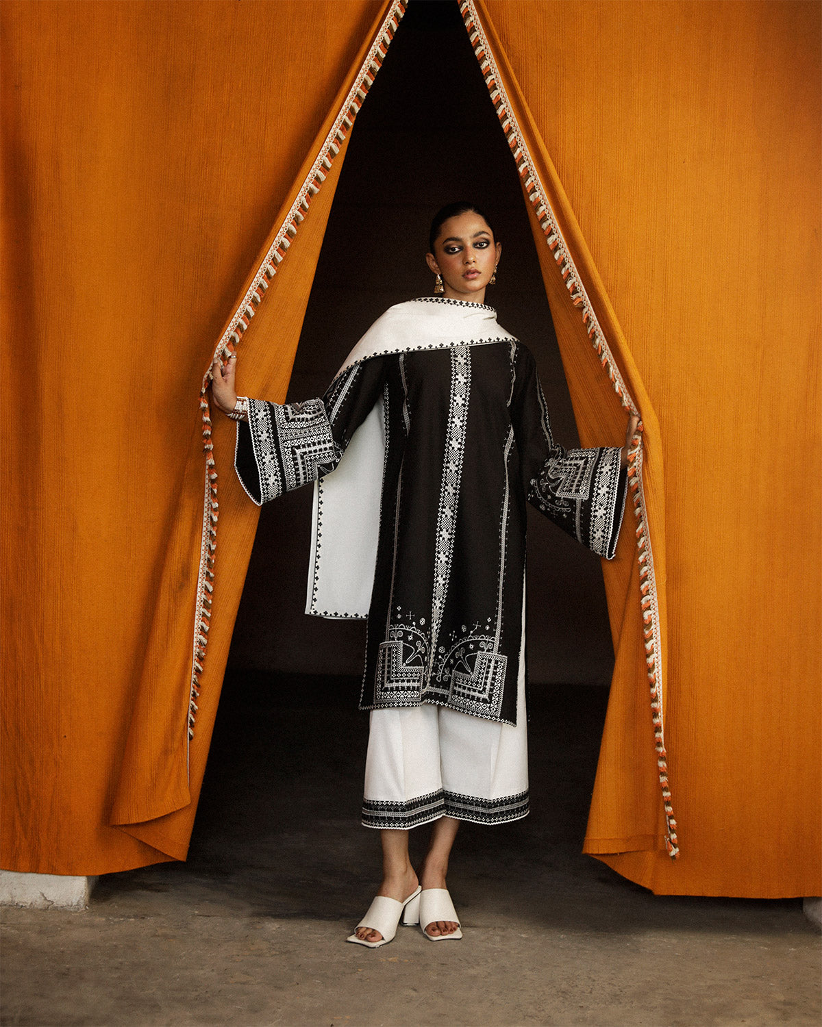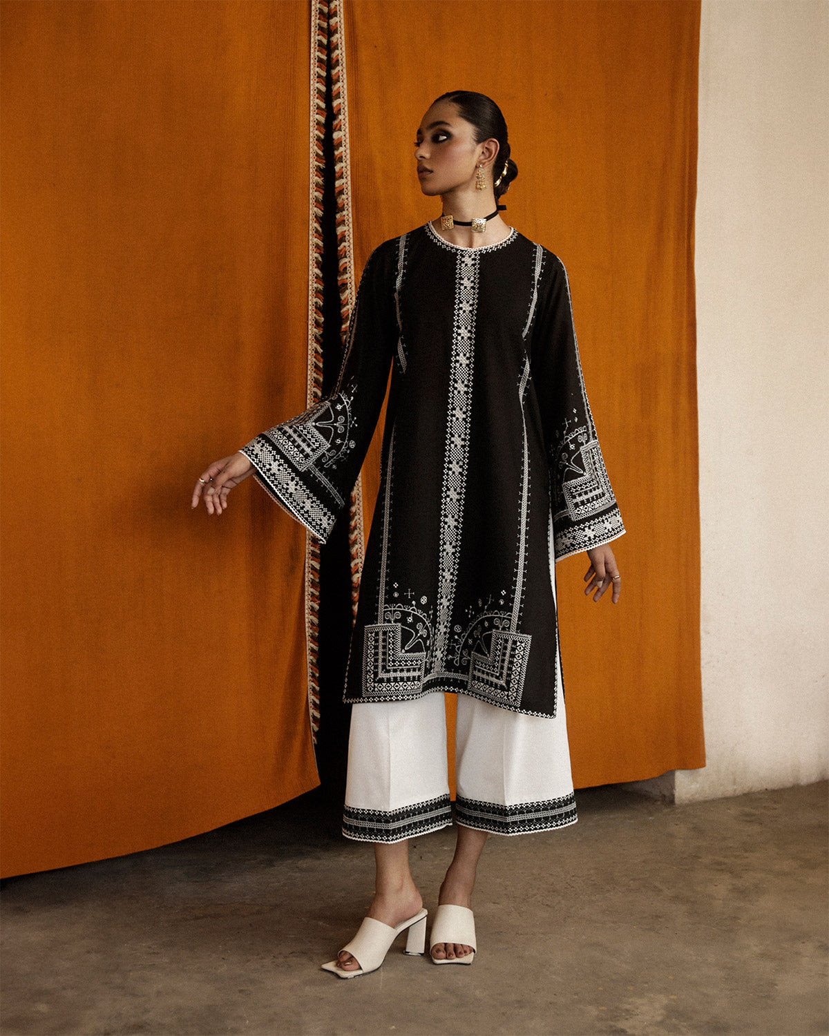 Description: Make a bold yet sophisticated statement with this striking black and ivory ensemble. The black shirt features a crew neckline and is adorned with intricate ivory tribal embroidery, adding a touch of cultural artistry and elegance. Paired with ivory culottes, the outfit achieves a harmonious contrast, with the culottes showcasing an embroidered hem and delicate lace insert details that enhance the overall sophistication. This combination of rich black with refined ivory accents creates a look that is both eye-catching and versatile, perfect for making a memorable impression at any occasion.