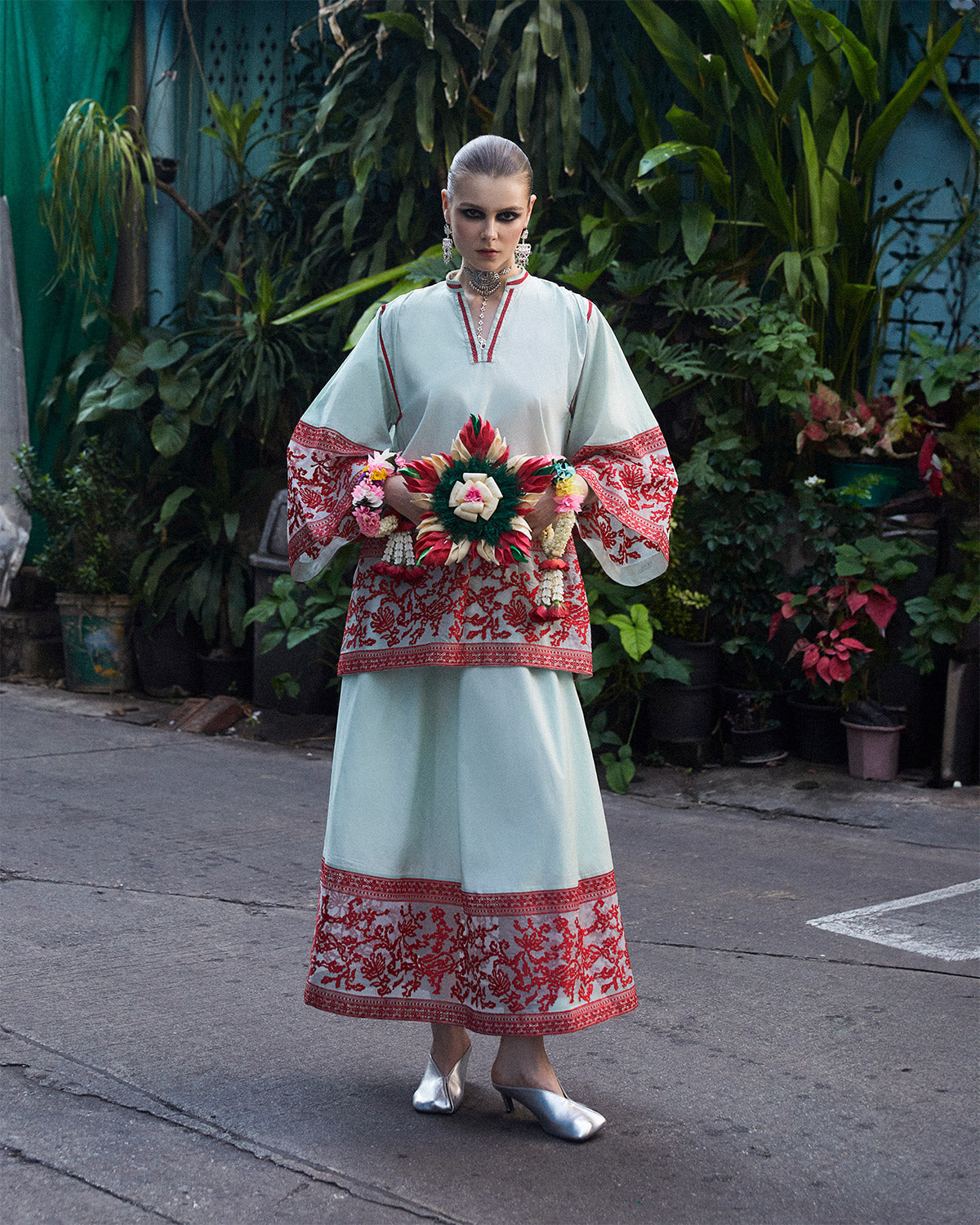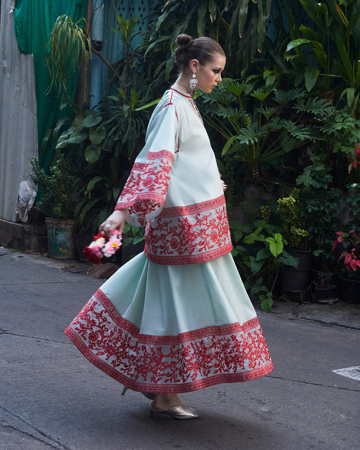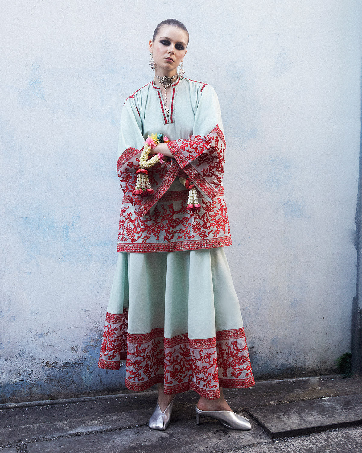 Product Description: A harmonious blend of elegance and tranquility, delicate red embroidery adorns the cotton net borders of this mint green kurta and skirt set. Perfect for any occasion, this ensemble effortlessly combines traditional charm with contemporary allure.