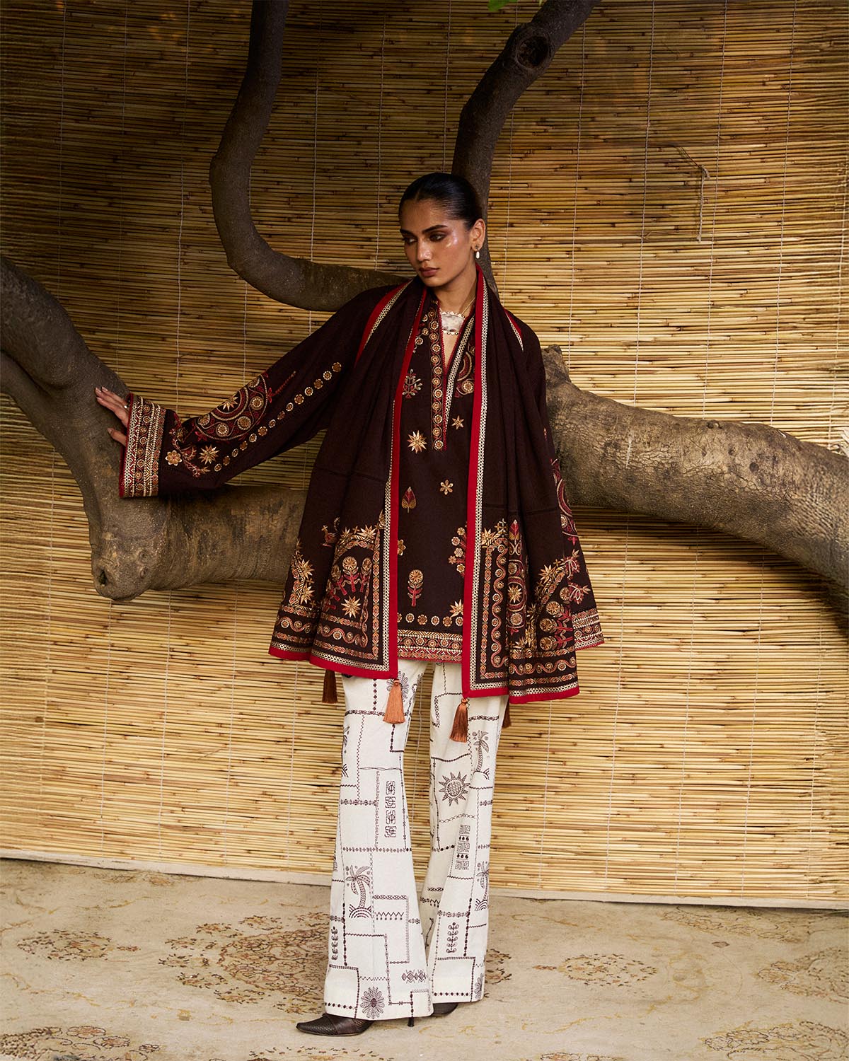 Description: A short brown shirt with multicolor embroidery, styled with bell sleeves and paired against ivory pants. A matching embroidered scarf brings balance — earthy richness set against serene contrast.