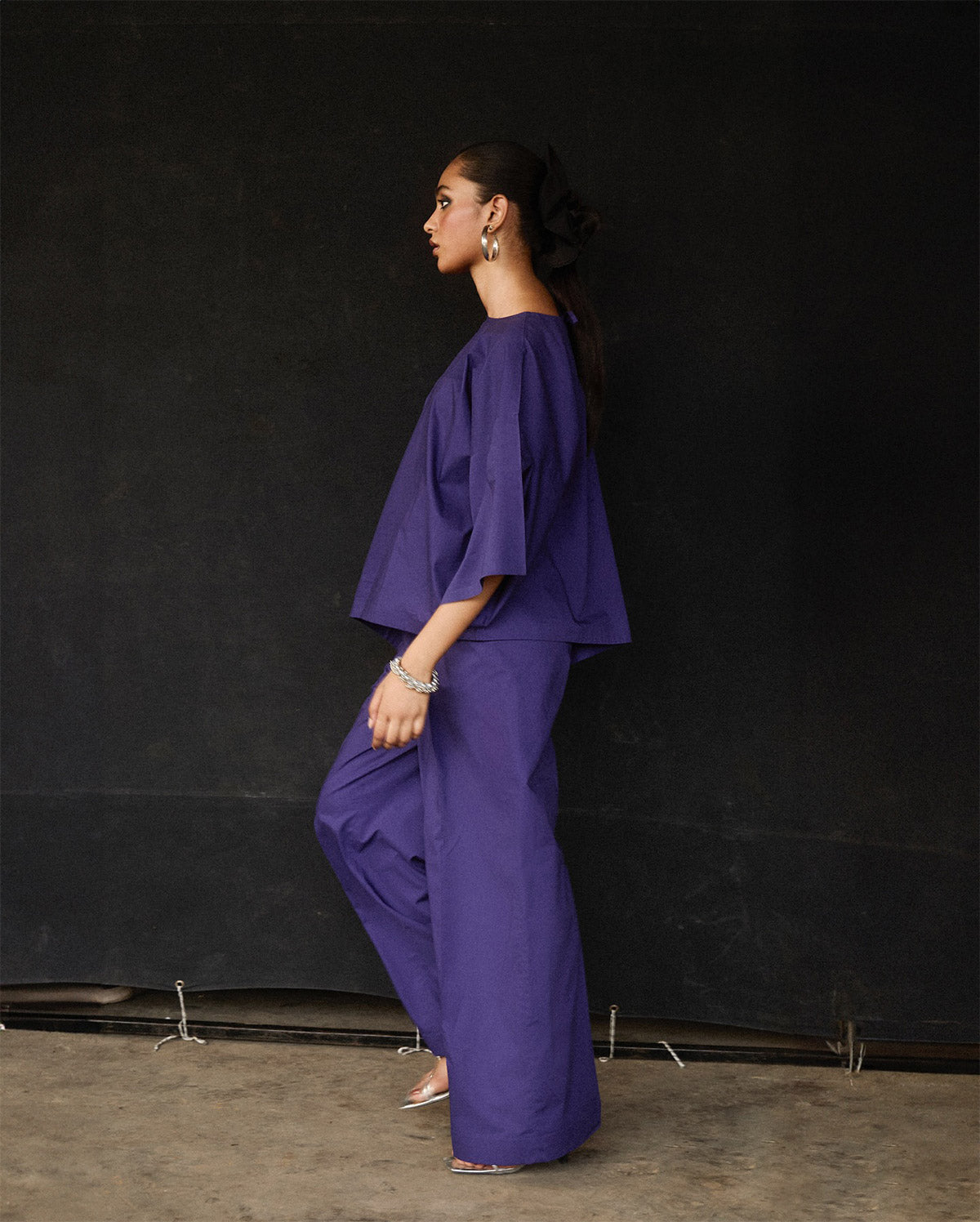 Description: Exude modern elegance with this sophisticated aubergine coord set. Crafted from soft, breathable cotton, the ensemble features an asymmetrical shirt that adds a contemporary edge to your look. The shirt’s unique cut is complemented by flared pants, which provide a graceful, flowing silhouette. A bowtie back closure enhances the outfit with a touch of charm and refinement, making it a versatile choice for both formal and casual occasions. The rich aubergine hue brings a deep, luxurious feel to the set, ensuring you stand out with effortless style..